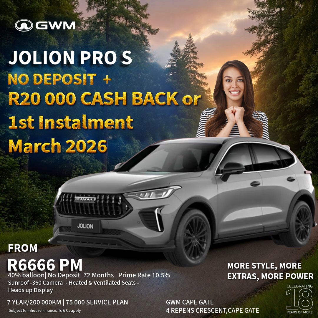 No Deposit + R20 000 cash back or 1st installment March 2026